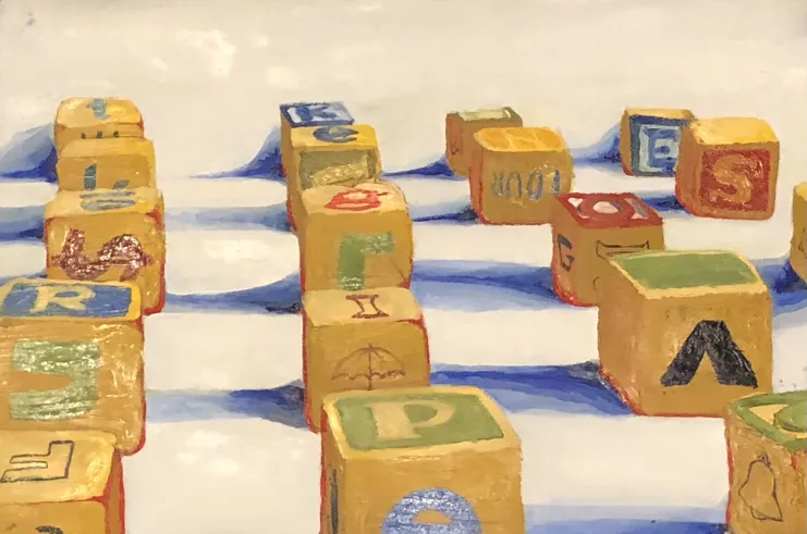 Rows of cubes with harsh blue shadows fill the scene. They hide a hidden message.