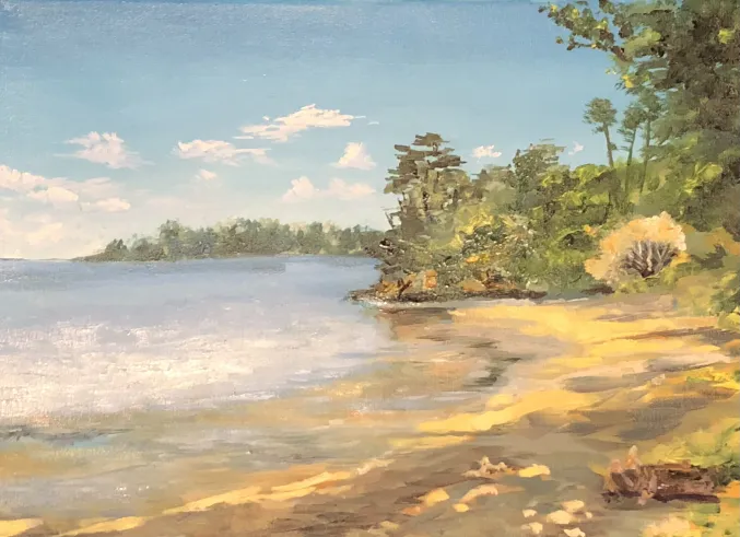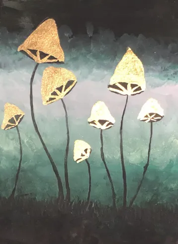 Using golf leaf, ori was able to depict a whimsical mushroom scene.