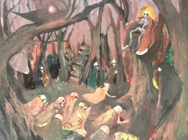 A creative adaptation of the aftermath of the Shakespearean play βMacbethβ. It depicts Macbeth in hell, ruling over skeleton worshippers like a king. 3 witches can be found with glowing eyes.