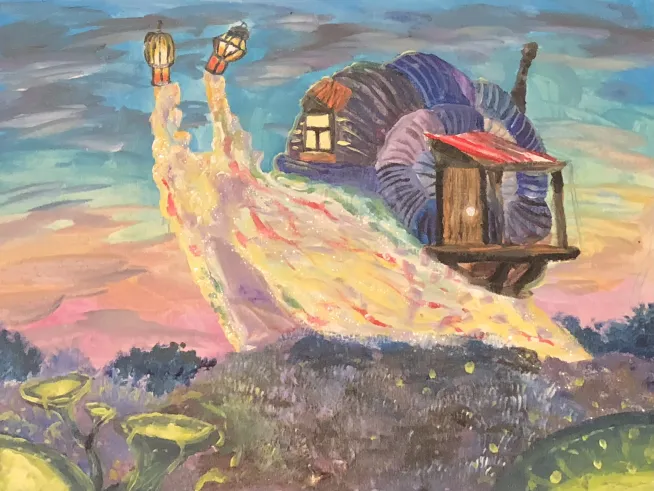 An alternate look on the snail house painting. This time it is in the normal world and it is a simple snail. Ori was utilising the dot technique. Every stroke was a dot. LINK Fretty cool paint