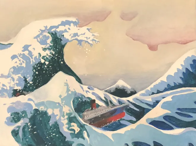 This is a parody peice on The Great Wave. Instead of Japanese fishermen, ori added the titanic
