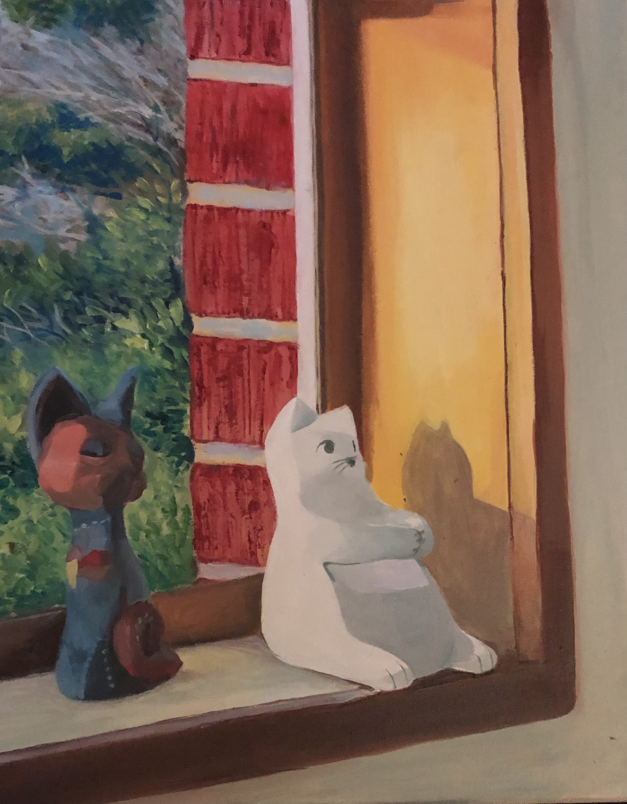 Two cat sculptures sit on a sunny windowsill. The blue one is a gift to oris grandmother and the white one is a gift to ori from his childhood friend.